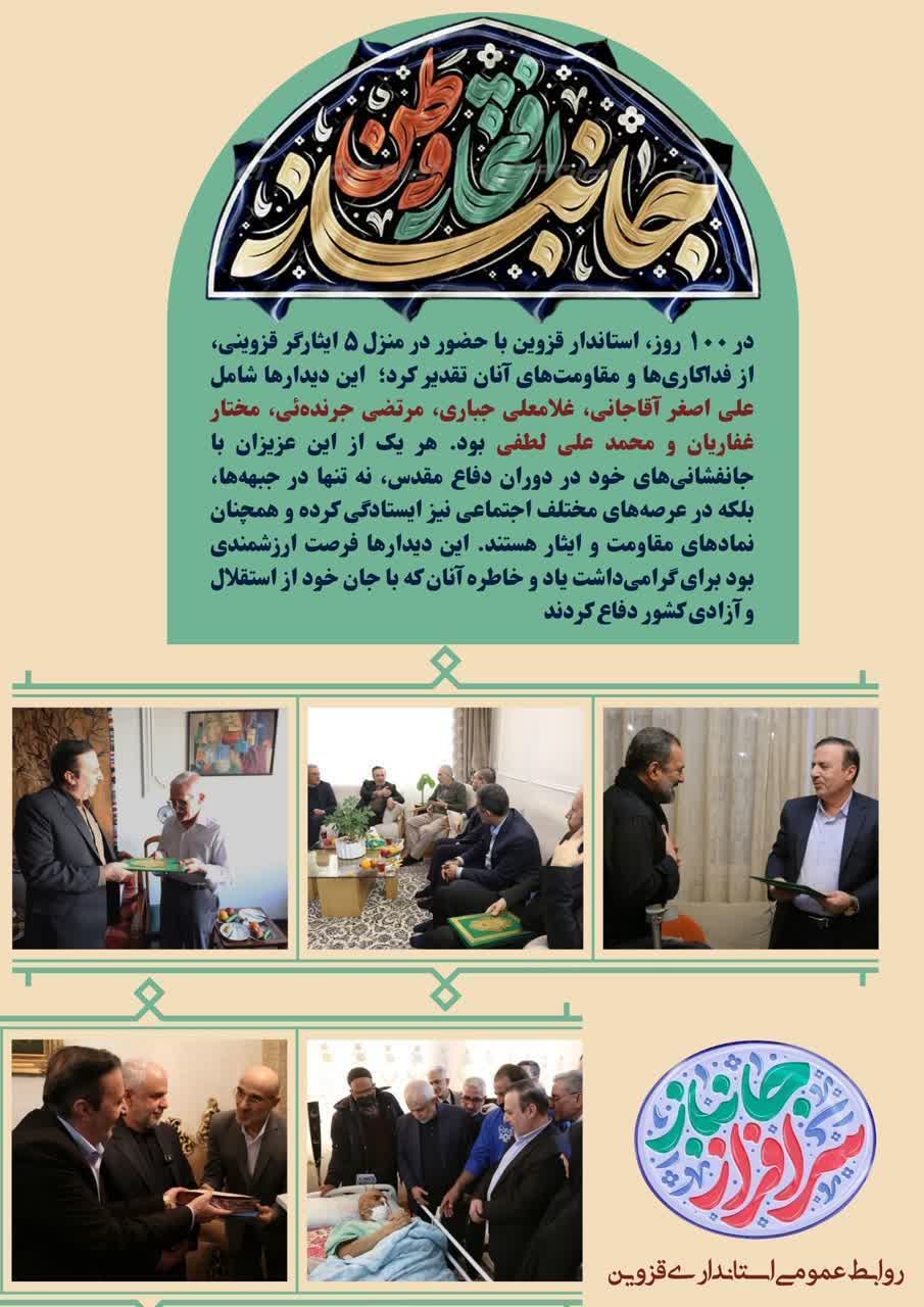در ۱۰۰ روز، استاندار قزوین با حضور در منزل ۵ ایثارگر بزرگ، از فداکاری‌ها و مقاومت‌های آنان تقدیر کرد.  این دیدارها شامل علی‌اصغر آقاجانی، غلامعلی جباری، مرتضی جرنده‌ئی، مختار...