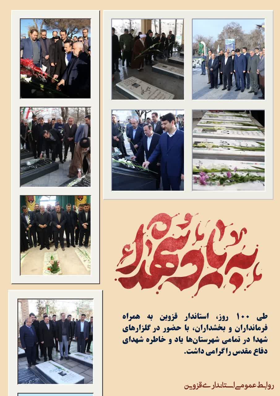 در ۱۰۰ روز، استاندار قزوین به همراه فرمانداران و بخشداران، با حضور در گلزارهای شهدا در تمامی شهرستان‌ها، یاد و خاطره شهدای دفاع مقدس را گرامی داشت.  این حضور، نشانی از ادای احترام...