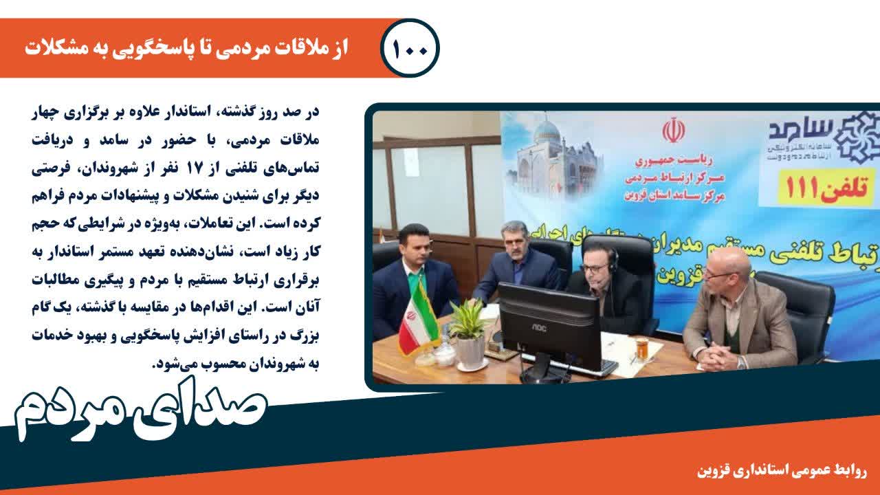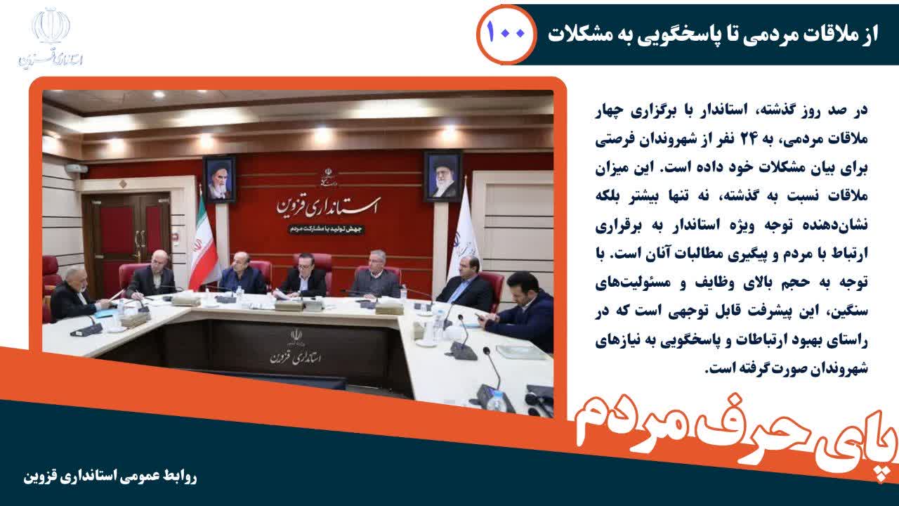 در ۱۰۰ روز گذشته، استاندار قزوین با برگزاری جلسات ملاقات مردمی، فرصت گفت‌وگوی بی‌واسطه با شهروندان را فراهم کرده است، مردم دغدغه‌های خود را مستقیم مطرح می‌کنند و پاسخ شفاف دریافت می‌کنند....