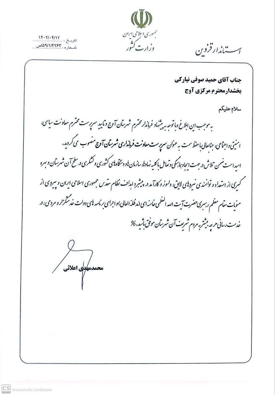طی حکمی از سوی محمدمهدی اعلایی استاندار قزوین، حمید صوفی نیارکی به عنوان سرپرست معاونت فرمانداری شهرستان آوج منصوب شد.