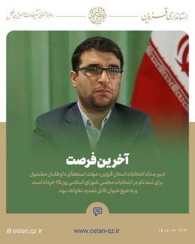 دبیر ستاد انتخابات استان قزوین: با توجه به جدول زمان بندی انتخابات، آخرین مهلت استعفای داوطلبان مشمول ماده 29 قانون انتخابات روز 25 خرداد ماه سال جاری می باشد و این مهلت به هیچ وجه تمدید نخواهد شد